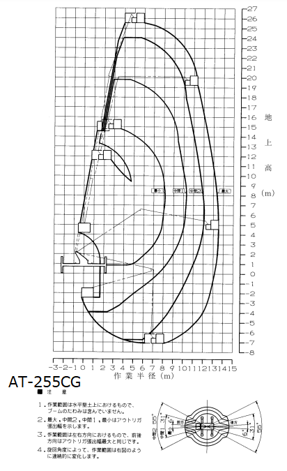 | AT-255CG | AMC-3(作業範囲規制装置、ブーム・バスケット干渉防止機能付、自己診断機能付)、安全ベルト用ロープ掛け、フットスイッチ(バスケット部)、操作レバーガード、非常用ポンプ、緊急停止装置(表示灯付)、ジャッキインタロック装置、ブームインタロック装置、アウトリガインジケータ、油圧シリンダロック装置、シフトレバーインタロック装置、パーキングブレーキ警報装置、PTO切り忘れ警報装置、油圧安全弁、水準器 |