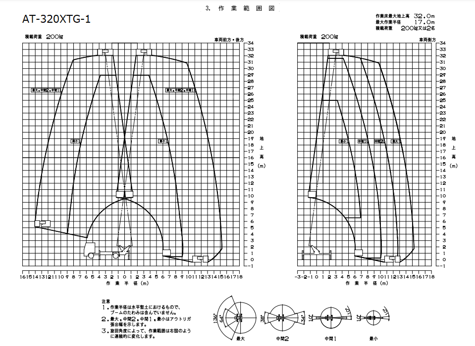 | AT-320XTG-1 | AMC(過負荷防止装置)[ブーム干渉防止機能付、自己診断機能付]、墜落制止用器具フック掛け、フットスイッチ(バスケット部)、操作レバーガード、非常用ポンプ、緊急停止装置(表示灯付)、ジャッキインタロック装置、ブームインタロック装置、アウトリガインジケータ、油圧シリンダロック装置、シフトレバーインタロック装置、パーキングブレーキ警報装置、PTO切り忘れ警報装置、油圧安全弁、水準器、後退時車両直後確認装置(バックカメラ) |