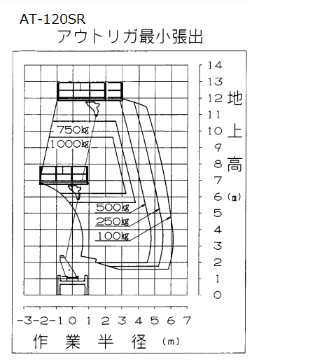 AT-120SR 過負荷防止装置(AMC)、音声警報装置、車両・ブーム干渉防止装置、ブーム・デッキ干渉防止装置、フットスイッチ(デッキ部)、操作レバーガード、非常用ポンプ、緊急停止装置(表示灯付)、ジャッキインタロック装置、ブームインタロック装置、アウトリガインジケータ、油圧シリンダロック装置、油圧安全弁、水準器