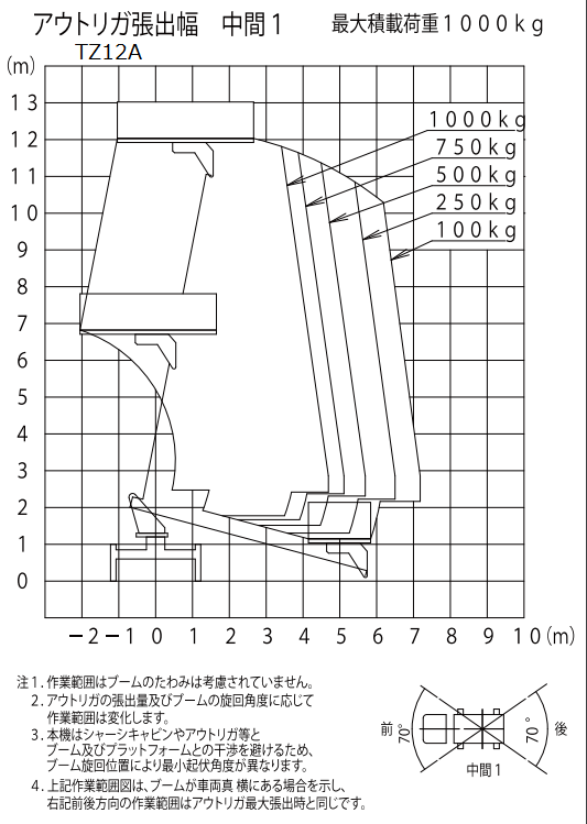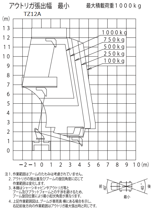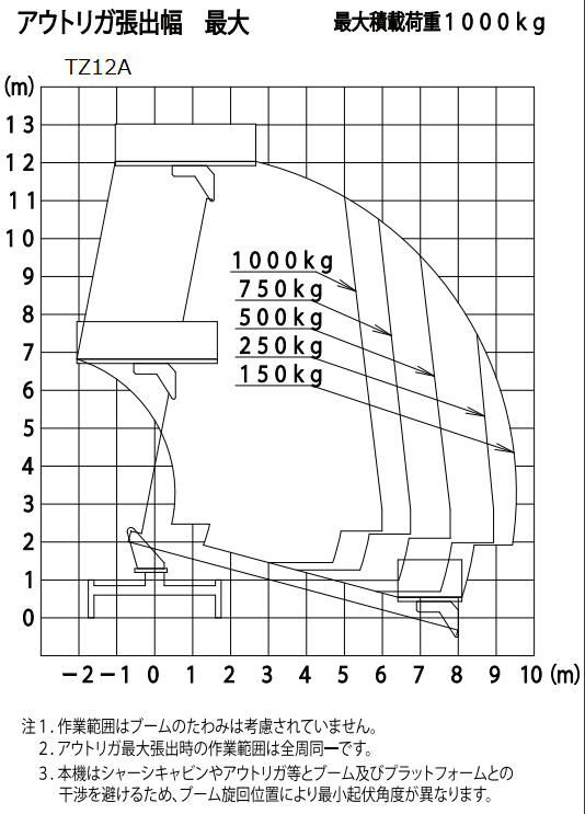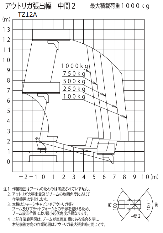 | TZ12A | 油圧系安全装置、アウトリガー張幅検知装置(AMCS)、作動停止スイッチ、キャビン・ブーム干渉防止装置、ブーム作業床干渉防止装置、非常用ポンプ、旋回・旋回速度規制装置、音声通知装置、ジャッキ・ブームインターロック装置、レバーガード、レバーガード、フートペダル |